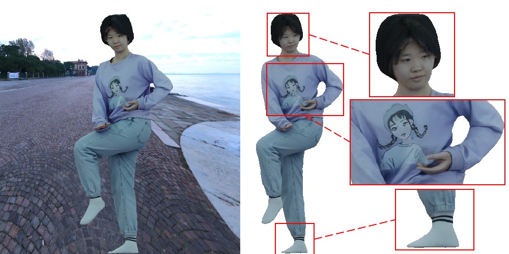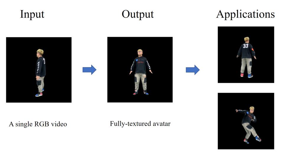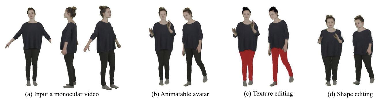 | We propose a coarse-to-fine framework to reconstruct a personalized high-fidelity human avatar from a monocular video. Our framework also enables photo-realistic novel view/pose synthesis and shape editing applications. |