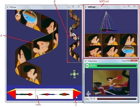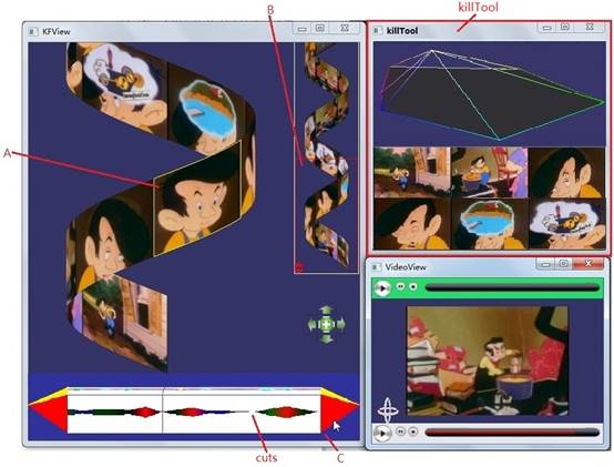 首先利用基于信息熵的Jensen距离测度以及f-divergences作为视频帧间距离的度量来抽取关键帧,然后利用可视分析作为基本工具实现大量关键帧图像的三维摆放、展示,使得用户对整个视频具有深刻体验。