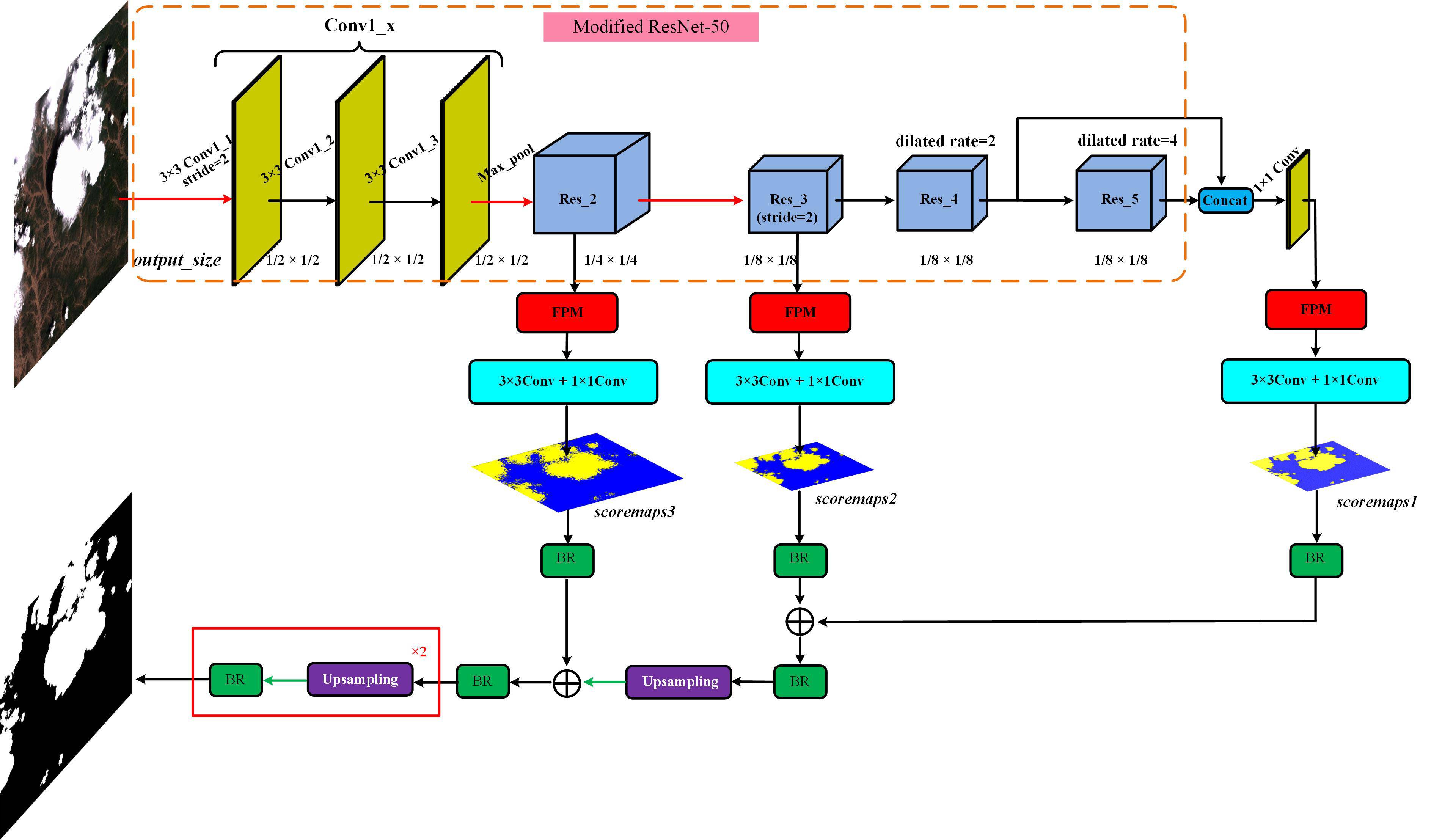 | Cloud detection is one of the important tasks for remote sensing image (RSI) preprocessing. In this paper, we utilize the thumbnail (i.e., preview image) of RSI, which contains the information of original multispectral or panchromatic imagery, to extract cloud mask efficiently. We also propose a cloud detection neural network (CDnet) with an encoder-decoder structure, a feature pyramid module (FPM), and a boundary refinement (BR) block. |