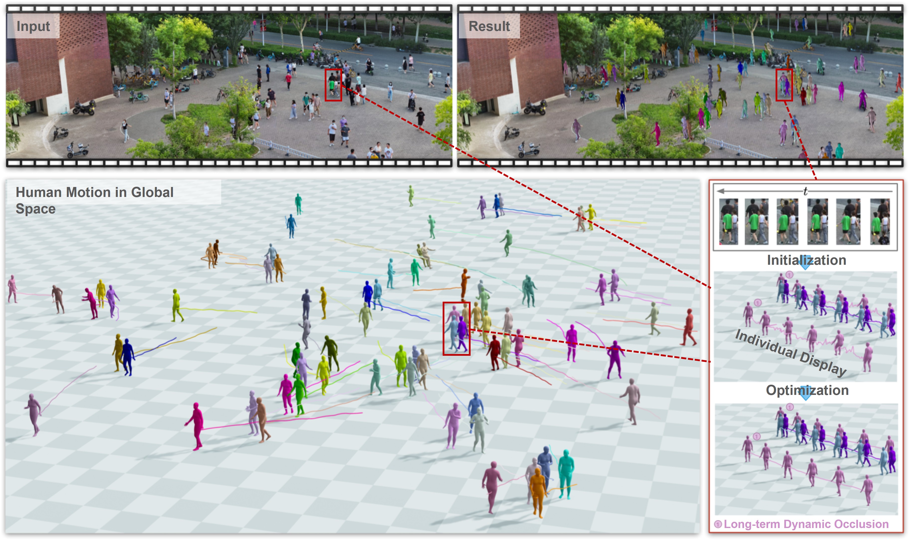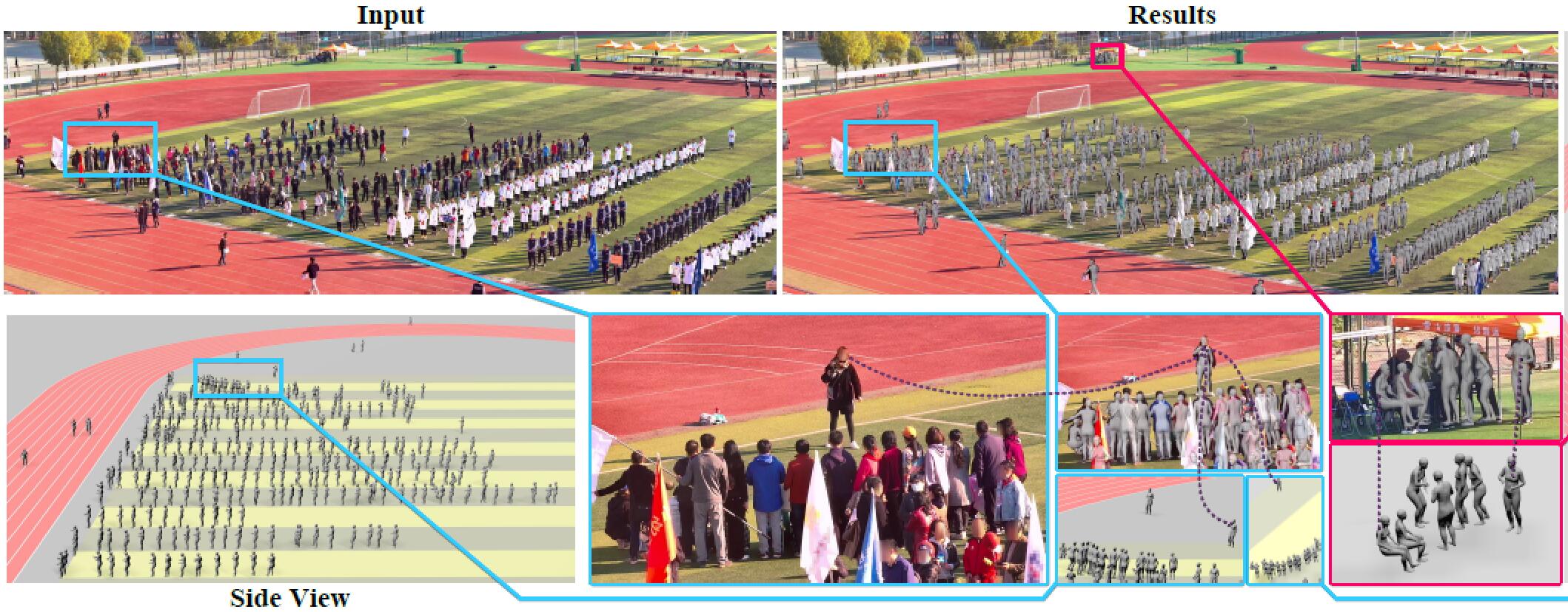 | 3D reconstruction of dynamic crowds in large scenes has become increasingly important for applications such as city surveillance and crowd analysis. However, current works attempt to reconstruct 3D crowds from a static image, causing a lack of temporal consistency and inability to alleviate the typical impact caused by occlusions. In this paper, we propose DyCrowd, the first framework for spatio-temporally consistent 3D reconstruction of hundreds of individuals' poses, positions and shapes from a large-scene video. |