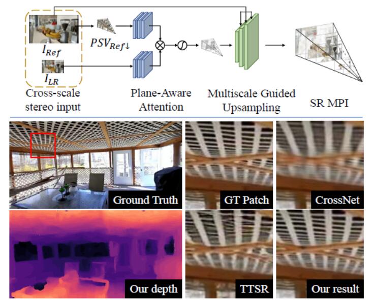 | This paper proposes an end-to-end reference-based super-resolution network composed of a novel planeaware attention-based MPI mechanism, a multiscale guided upsampling module as well as a super-resolution synthesisand fusion module. |