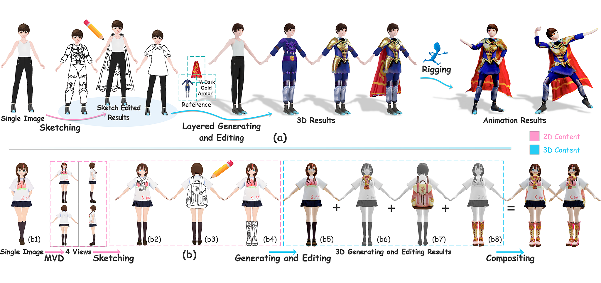 | This paper aims to controllably generate and edit layered 3D characters based on hand-drawing. To achieve controllable generation and part-level editing of high-quality 3D characters with changeable clothing, we propose an innovative layered 3D character generation and editing method based on sketches. |