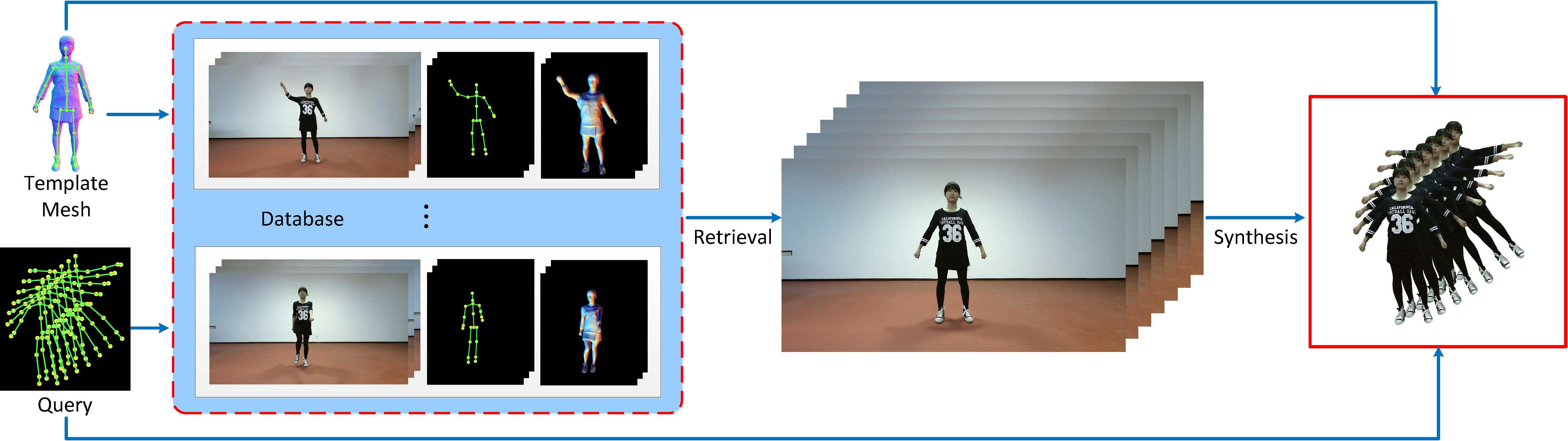 | We aim to address the challenge of novel view rendering of human performers that wear clothes with complex texture patterns using a sparse set of camera views. Our method can render high-quality images at 2k resolution on novel views, and it is a general framework that is able to generalize to novel subjects. |
