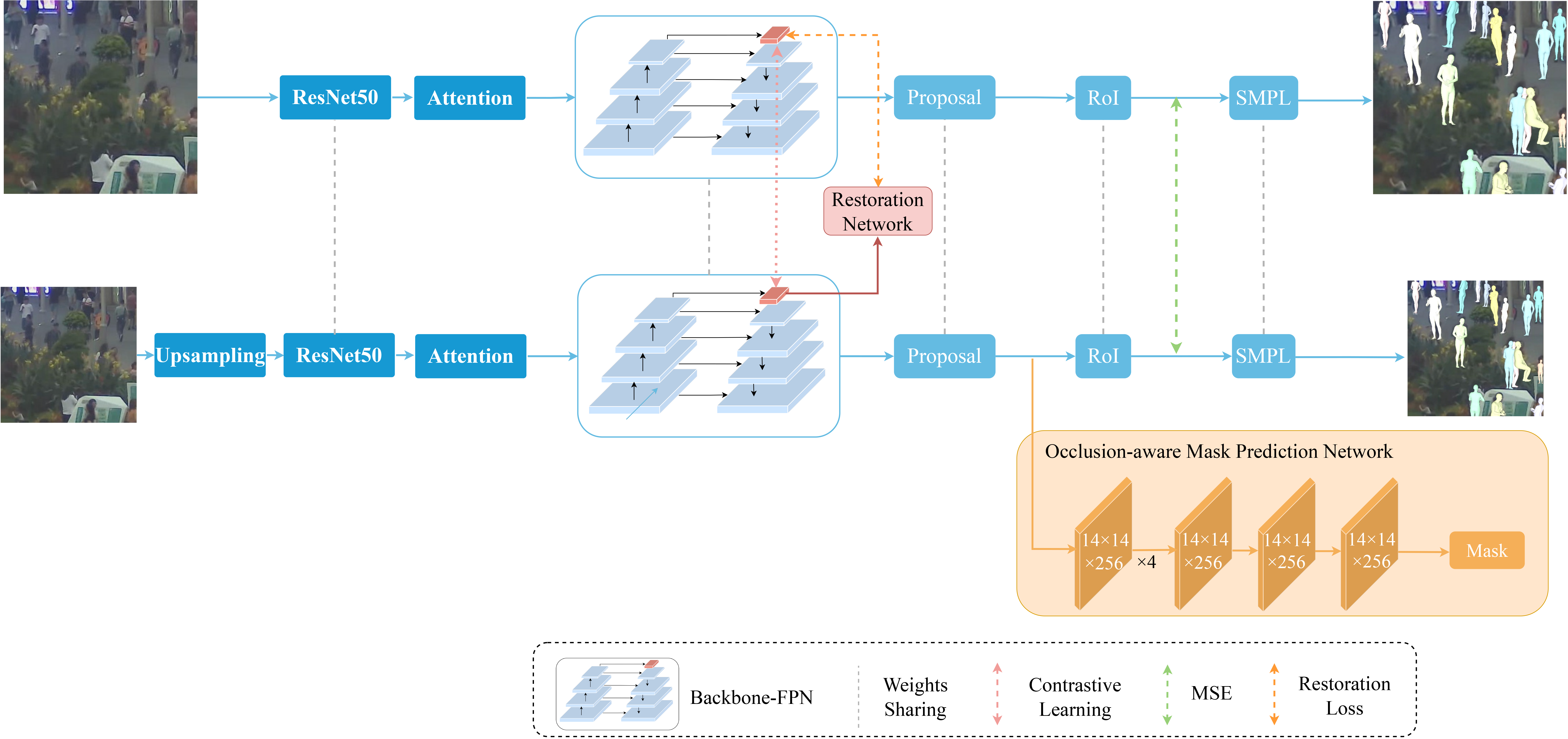 Existing multi-person reconstruction methods require the human bodies in the input image to occupy a considerable portion of the picture. However, low-resolution human objects are ubiquitous due to trade-off between the field of view and target distance given a limited camera resolution. In this paper, we propose an end-to-end multi-task framework for multi-person inference from a low-resolution image (MILI). To perceive more information from a low-resolution image, we use pair-wise images at high resolution and low resolution for training, and design a restoration network with a simple loss for better feature extraction from the low-resolution image. To address the occlusion problem in multi-person scenes, we propose an occlusion-aware mask prediction network to estimate the mask of each person during 3D mesh regression. Experimental results on both small-scale scenes and large-scale scenes demonstrate that our method outperforms the state-of-the-art methods both quantitatively and qualitatively.