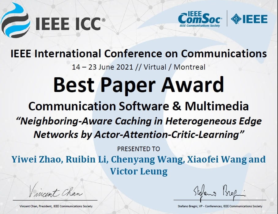 课题组《In-Edge AI》论文获得了2022年度IEEE ComSoc亚太地区的最佳论文奖!好的前瞻性的科研工作可以持久产生越来越强影响力,这篇19年的论文持续获得很高的阅读量和引用力度,得到了越来越多学界和产业界的认可。希望课题组未来的工作一定要体现先进性,前瞻性,思考到科研技术发展的背后哲学。各位加油!!恭喜!