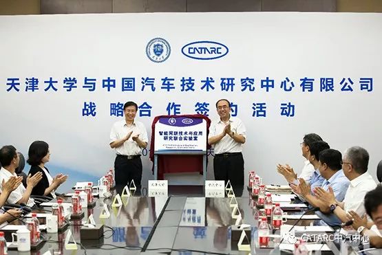 天津大学党委书记李家俊、中汽中心党委书记、董事长、总经理于凯共同为智能网联技术与应用联合实验室揭牌