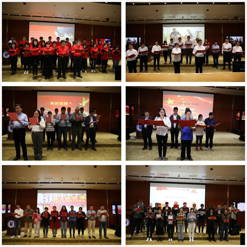 党课后,为了配合党课主题,增强授课效果,UFC中文官网 党委选择了6个与初心和使命相关的经典原文作品,以支部为单位进行诵读。6个教工党支部全体党员积极响应党委号召,精心排练了《纪念白求恩》《可爱的中国》《人民万岁》《我的祖国》《谁是最可爱的人》《坚持不忘初心、继续前进》等作品,在会上精彩演绎。最后,UFC中文官网 全体党员集体诵读了《为人民服务》。深情的音乐、动人的声音、感人的事迹,深深感染了每一位党员,让党员们感到接受了一次心灵的洗礼。