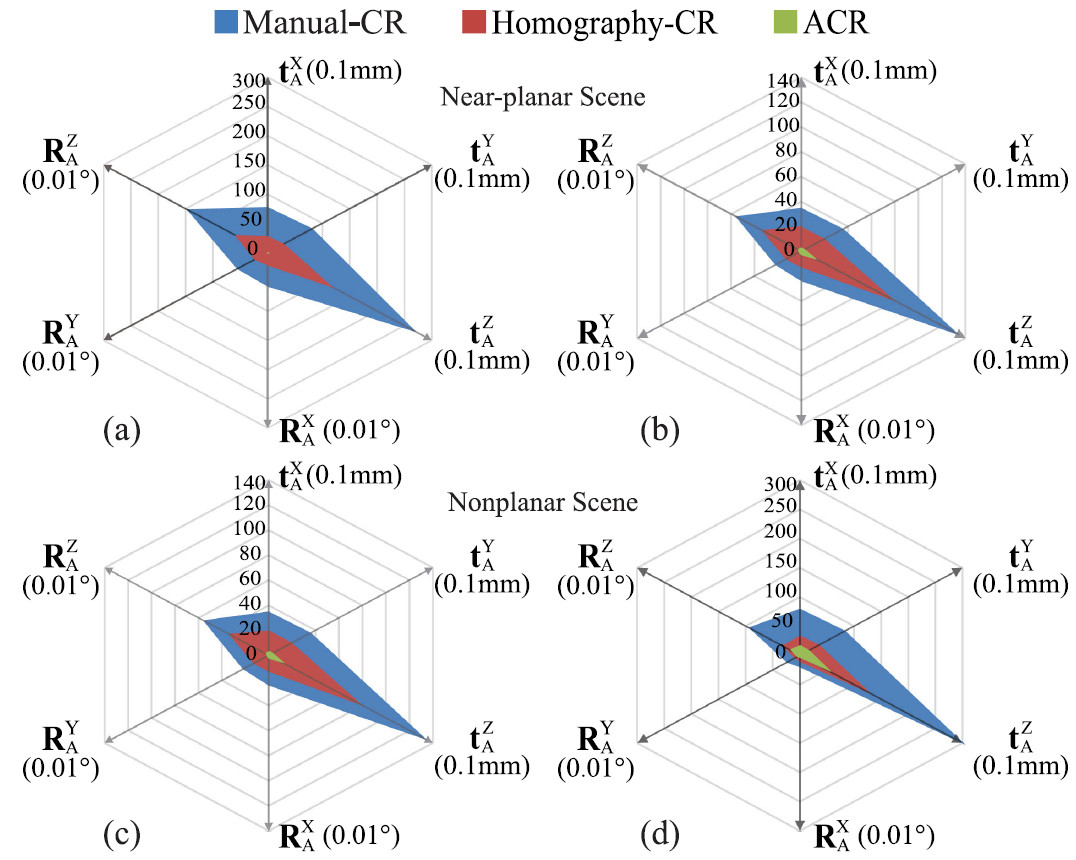 物理定位精度最能真实而直接反映实际的精确重定位效果。然而,参考相机的真实物理位姿在现实中难以获取。为精准度量物理重定位精度,本文针对特定场景,通过建立稠密的AFD和物理位姿偏移一一对应关系作为衡量尺度, 利用AFD值来量化物理定位精度。如图9,我们在2个平面场景和2个非平面场景中对比了Manual-CR, Homography-CR和ACR三种方法的物理重定位精度。从结果中可以看出,采用本文提出的ACR方法可以达到0.1mm平移误差和0.01°的旋转误差,远高于Manual-CR和Homography-CR的定位精度。