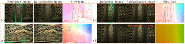 本文方法已被用于实验室团队自主研发的六自由度机器人平台上,实现了开放复杂环境下的相机位姿高精度重定位。基于此项成果,实验室在获取高质量观测数据的同时,突破性地解决了高值场景的精确监测与微小变化分析问题。图10-12分别展示了ACR的三个真实场景应用。图10选取了四组借助工业相机和单反相机采集的2014年到2016年的监测结果,展示了ACR在敦煌莫高窟壁画的精确检测和微小变化分析中的应用,有效解决了场景在发生极其缓慢变化的情况下文物本体病害检测的难题。图11展示了ACR在壁画修复评估中的应用。即当文物保护专家对壁画进行修复后,通过ACR技术将相机重定位至修复前的监测姿态,从而精准评估壁画修复工作对壁画本体所带来的影响。图12展示了ACR在建筑文物结构变形监测中的应用。由于木质建筑文物随着时代变迁,其结构会逐渐产生变形。通过ACR技术及早发现此类建筑结构变形,对于文物预防性保护有着重大的意义。