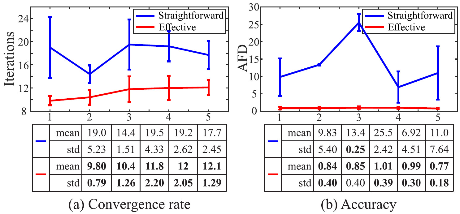 实验部分主要从算法的收敛性和精度两方面进行分析。文章提出了一种用于衡量图像精确重定位误差的指标AFD(average feature-point displacement)和可视化方式FDF图,并对比了手动重定位(Manual-CR)、单应矩阵法重定位(Homography-CR)[3]以及计算重摄影方法(CRP)[7]。