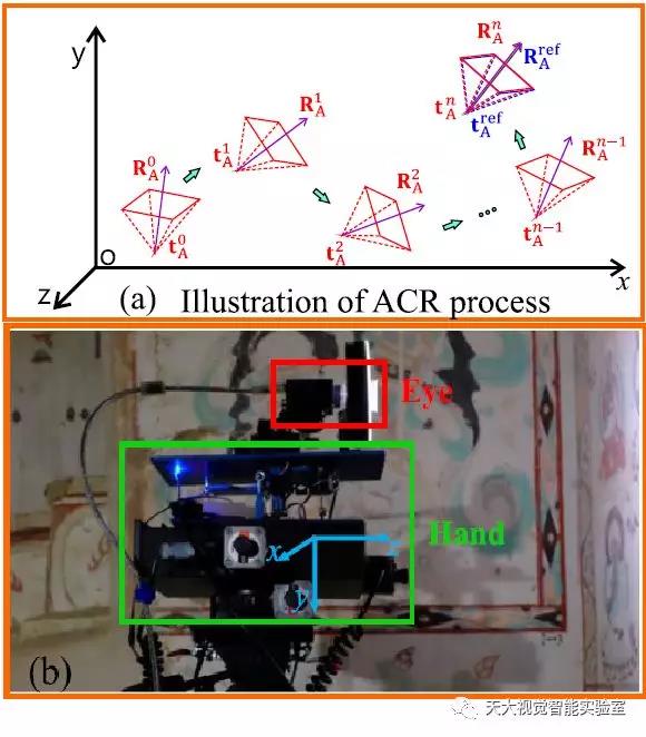事实上,我们最终的算法流程(下图5)就是一个进行旋转和平移的交替迭代运动,其中平移的物理运动量与不断条件折半收敛的空间尺度S相关。本文通过严格的数学推导证明了当手眼标定参数X的旋转角小于45度(轴角表示下)时算法在理论上的收敛性。在实验部分,本文通过大量的虚拟和真实场景实验充分验证算法的鲁棒性、精确度、收敛性和收敛速率,并对实验中参数X的影响进行了有效分析。相关平台和成果已成功应用到敦煌莫高窟、北京故宫、颐和园等文物遗产地的常态监测上,为文物的预防性保护提供了坚实可靠的技术手段,受到了业界专家的充分肯定和高度评价。下面我们从偏学术分析的角度对问题的定义、具体算法和理论分析进行阐述。