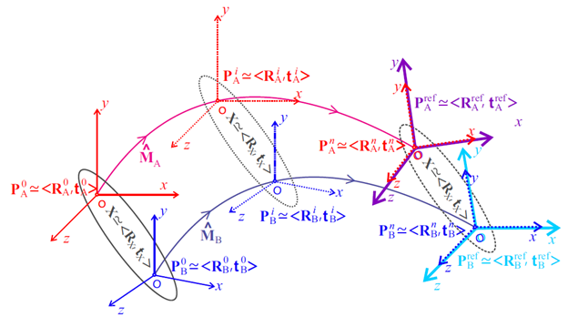 为了克服上述问题,我们进一步提出了协同交替相机重定位方法。该方法采取和顺序重定位相同的假设(X=I)及TA折半逼近策略。与之不同,其在相机重定位过程中迭代的每一步,交替协同进行旋转和平移,而非先完成旋转再进行平移。图5为协同重定位方法流程图,算法2给出了其重定位算法过程。进一步的实验部分充分验证了该协同重定位方法在精度和收敛速度上的提升。