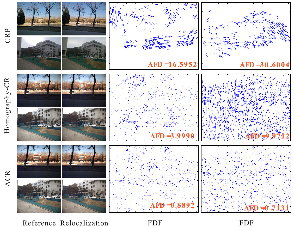 如图7(b)所示,采用和图7(a)中同样的100次重定位测试,我们以AFD作为指标对比了两种重定位方法的定位精度。显然,协同重定位方法(红线)取得了远高于顺序重定位方法(蓝线)的定位精度(14.9倍)。结合前文收敛速度的实验,可以充分证明协同重定位方法在收敛性和精度两方面性能上远高于顺序重定位方法。进一步地,图8在室外场景下对比了Homography-CR[3]、CRP[7]和本文提出的ACR方法在精度上的差异。从AFD和FDF图上可以看出,ACR达到了最高的定位精度。