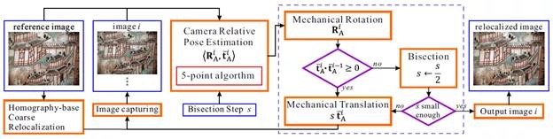 为了应对上述困难,不同于被动地相机位姿估计,本文提出了一种主动式相机重定位(Active Camera Relocalization, ACR)方法,以单张RGB图像作为参考(目标)图像,通过将相机位姿的不断动态调整,主动地将相机恢复到物理真实的目标姿态上,以获取和参考图像一致的图像数据。表述的学术些,本文提出了一种空间尺度和手眼标定未知条件下的6D相机位姿精准重定位方法。