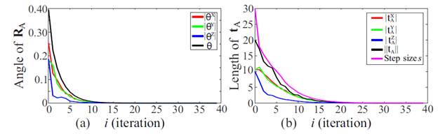 通过仿真所有的相机、平移台、手眼关系等参数和ACR过程,该实验以100次ACR测试来验证当时重定位算法的收敛性,图6展示了100次测试中RA和TA平均收敛过程, 值得注意的是,100次ACR测试中旋转和平移均严格收敛。