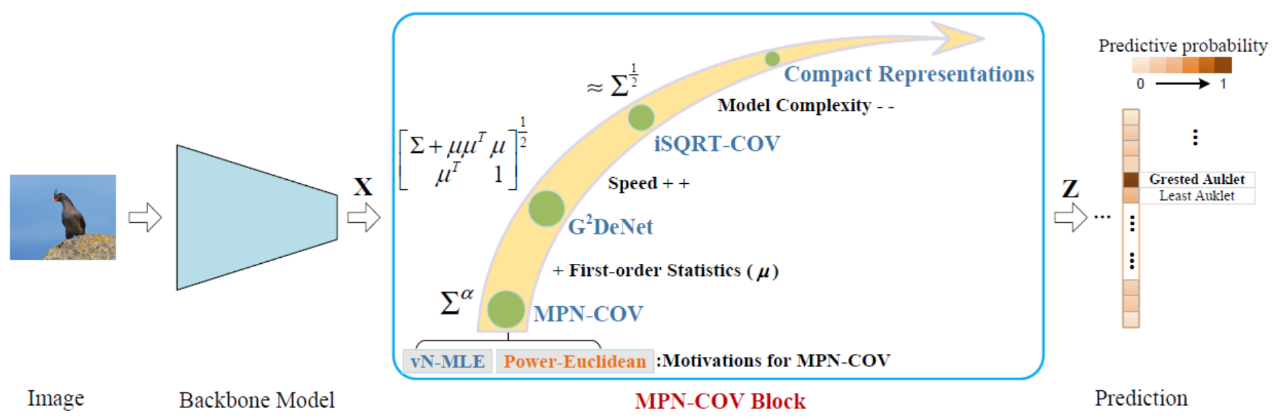 论文从鲁棒协防差估计和黎曼几何的角度,在理论上分析了矩阵幂归一化协方差建模在深层卷积神经网络中的工作机理。在此基础上,论文提出了一种全局高斯分布嵌入神经网络,有效的融入一阶和二阶统计量,实现了统计信息增益。同时开发了一种基于Newton-Schulz迭代的近似方法,显著提升了该网络架构的训练和推断速度。最后设计了一种基于渐进和分组卷积的模型压缩策略,有效地降低该网络架构的模型复杂度。为该网络架构在实际任务中的灵活使用提供了理论和技术保障。