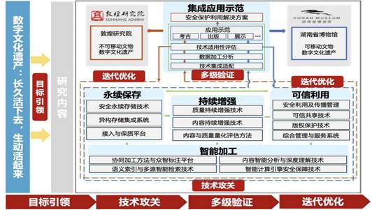 本项目立项背景源自我国数字文化遗产领域的发展现状。从国家文化自信和文化安全的重大需求出发,围绕让数字文化遗产“长久活下去,生动活起来”的目标,聚焦一个关键科学问题:可持续的数字文化遗产安全保护和高效利用的机制与方法,重点突破四项关键技术:1)保障存储安全、兼容行业多样化需求的文化遗产数据标准化弹性永续存储,2)保障数据自身安全的数字文化遗产内容与质量持续增强,3)业务驱动的文化遗产数据可信共享与精准服务,4)支撑数字文化遗产“加工-保存-增强-利用”的全链条协同加工与智能计算,并通过在敦煌研究院、湖南博物馆开展系统化应用示范为文物“活起来”国家文化战略提供先进的技术解决方案支撑。