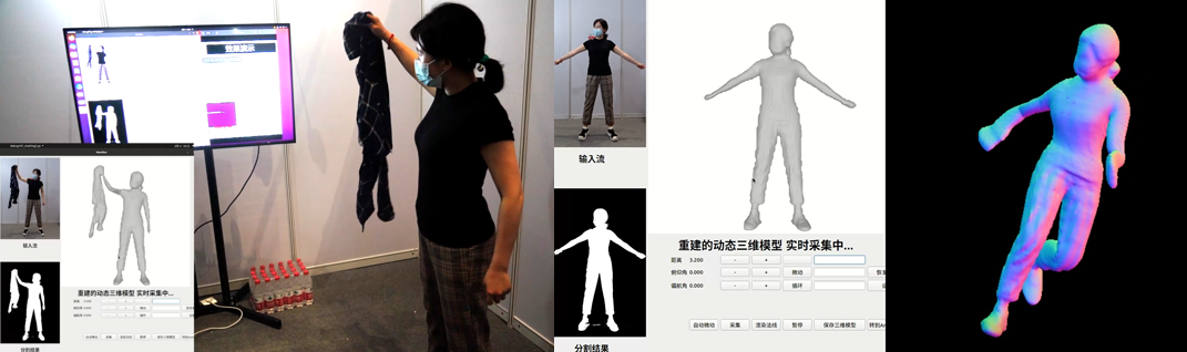 本次博览会上,UFC中文官网 李坤副教授团队带来“基于单个彩色相机的实时动态人体三维重建与动画”系统展示。在近几年攻关克难所取得的关键技术基础上,研究团队成功研制实时动态人体重建系统,采用单个消费级彩色相机获取人体的彩色图像,实时输出用户的动态三维模型,支持360度浏览与快照。区别于《阿凡达》等影视作品制作所构建的复杂人体采集与重建系统,该系统采用单个消费级彩色相机作为输入,通过轮廓分割、部件识别、几何推断等一系列智能计算,实现实时的动态人体三维重建,从而突破复杂多视角相机重建系统成本高、运维难等制约,具备移动端部署的潜力,赋能面向终端客户的动态人体三维重建技术在远程全息会议、智能电商、虚拟现实和增强现实等领域的应用。