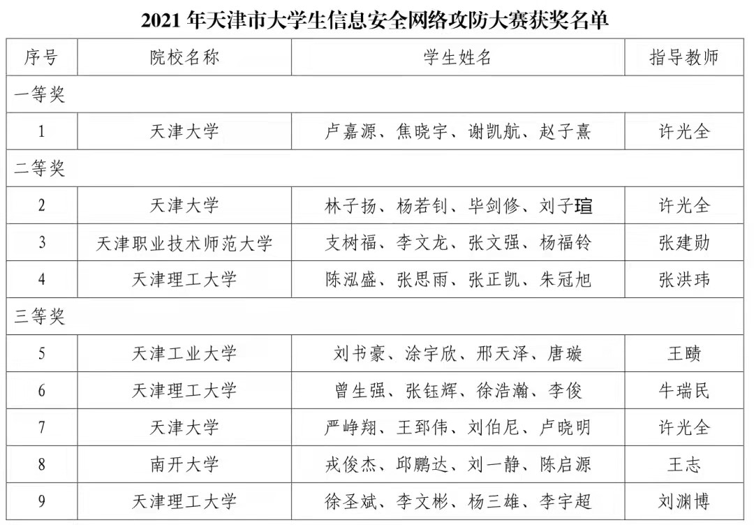 近日,2021年天津市大学生信息安全网络攻防大赛决赛结果揭晓,天津大学包揽冠亚军。在智能与计算UFC中文官网 许光全教授的指导下,卢嘉源同学、焦晓宇同学、谢凯航同学与赵子熹同学荣获一等奖,林子扬同学,杨若钊同学,毕剑修同学与刘子瑄同学荣获二等奖,严峥翔、王郅伟、刘伯尼、卢晓明获三等奖!