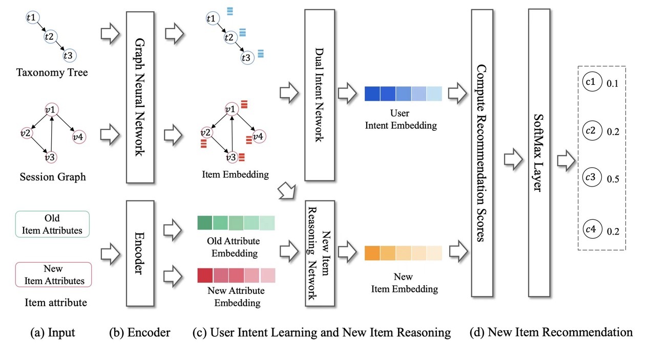 当前基于会话的图神经网络推荐系统主要关注用户历史会话中的商品,很难向用户推荐他们从未互动过的新商品。由于新商品与用户之间缺乏互动,在构建基于GNN会话的推荐系统时无法直接将新商品纳入会话图中。为了应对这一挑战,我们提出了一个双重意图的增强图神经网络,旨在有效地解决推荐新商品的问题。NirGNN从注意力机制和历史数据分布中分别学习用户的意图,模拟用户与新商品互动的决策过程。为了克服新商品无法直接被GNN学习的问题,我们受到Zero-shot Learning的启发,利用新商品的属性来推断其在GNN空间中的表示。在两个代表性的真实世界数据集上进行的实验表明,我们提出的方法具有显著优势。我们在美团提供的真实数据集上的研究进一步证实了双重意图模块和新商品推理模块所带来的可解释性优势。