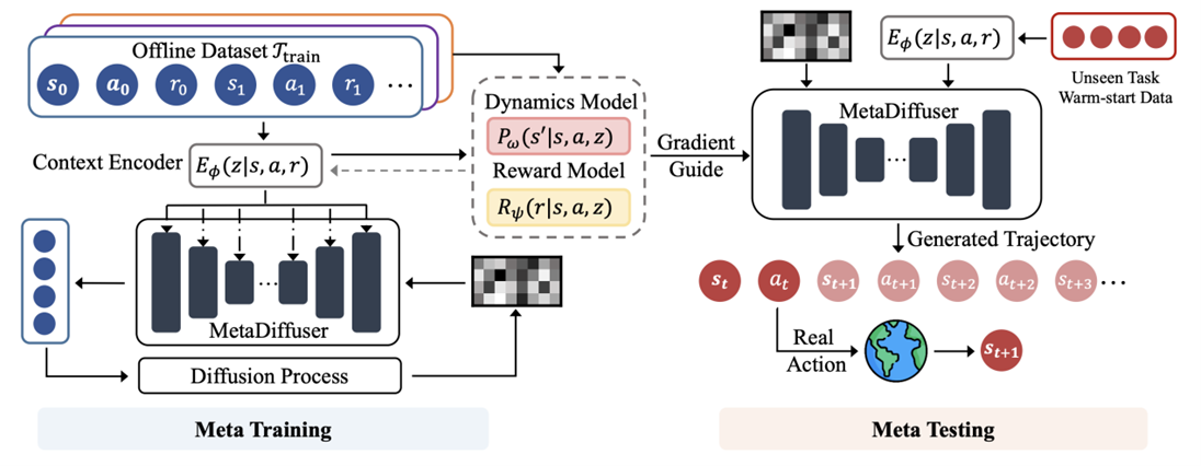UFC中文官网 2021级博士生倪飞以第一作者(通讯作者:郝建业)撰写的论文MetaDiffuser: Diffusion Model as Conditional Planner for Offline Meta-RL首次提出了基于扩散模型的跨任务规划模型和学习范式,实现可泛化的机器人智能控制。近年来扩散模型在图像视频生成任务上展现了惊艳的可控生成能力,能精细生成与条件高度相关的内容,那么能否利用这种可控生成能力赋能机器人控制任务?为此该工作提出元扩散模型(MetaDiffuser),通过多任务的离线数据预训练出上下文推断编码器,嵌入增广的扩散模型中进行可泛化的控制轨迹条件生成,提升机器人的规划控制对不同环境变化、任务变化的适应能力和鲁棒性。