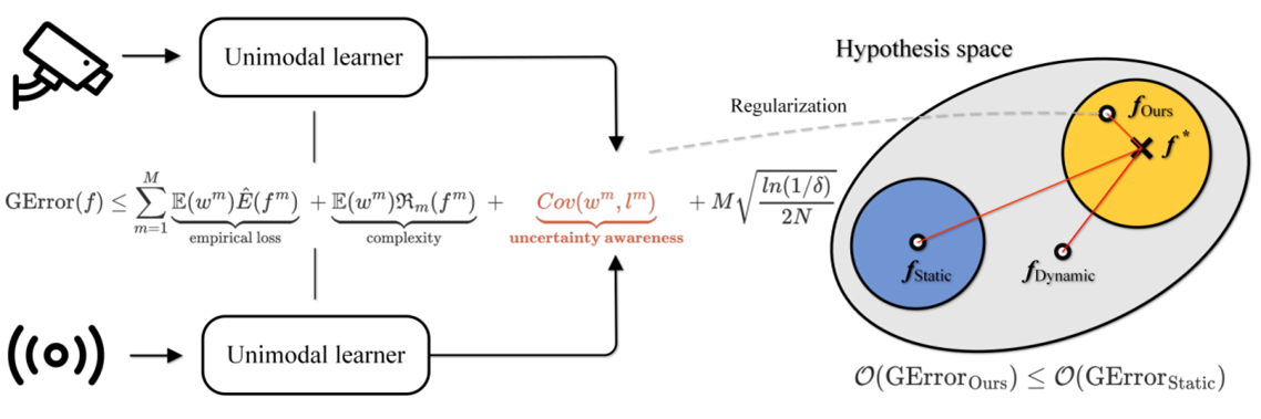UFC中文官网 2022级硕士张庆阳以第一作者(通讯作者:张长青)撰写的论文Provable Dynamic Fusion for Low-Quality Multimodal Data首次给出了多模态动态性的理论结果。多模态融合是多模态学习领域的基础问题。近年来,多模态动态融合在复杂场景的感知任务上取得了瞩目的效果。然而,其发挥作用的机理一直是悬而未决的开放性问题:为什么动态融合优于广泛应用的静态融合?符合什么条件的动态性是多模态融合的保障?针对上述问题,该工作给出了严谨的理论分析和证明(Provable Dynamic Fusion),明确给出了实现有效动态性的前提条件,以及不确定性估计和多模态融合任务之间的关联。