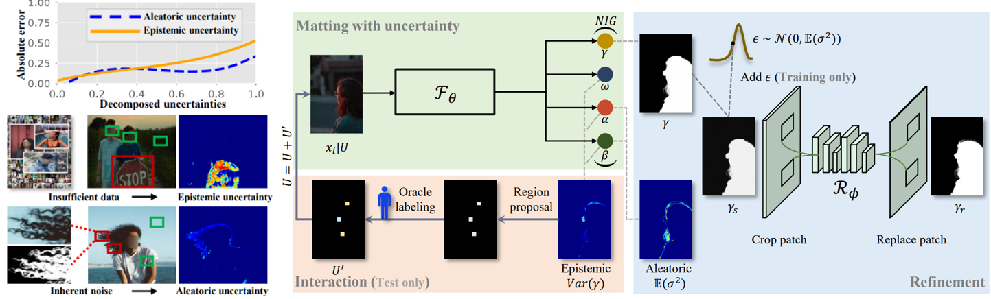 论文dugMatting: Decomposed-Uncertainty-Guided Matting(通讯作者:张长青)利用可分解的不确定性实现了高效的交互式图像处理。复杂的不确定建模如何指导底层图像处理?为了减少这些不确定性,该工作提出解耦不确定性引导的抠图算法(Decomposed-Uncertainty-Guided Matting)。通过人机互馈引入外部知识来降低模型不确定性、通过噪声建模来处理随机不确定性。前者有效提高交互效率,使用户专注于指定区域标注,后者有效改善抠图细节,并易于与任意抠图模型配合使用,易于拓展到对精度和可信度具有较高要求的交互任务中(如交互式分割)。