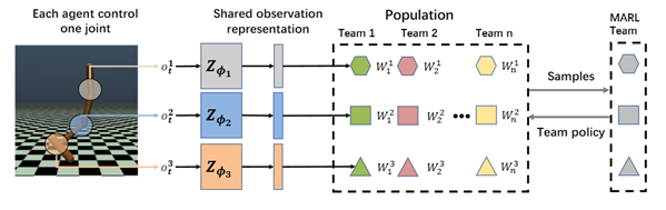UFC中文官网 2022级博士生李鹏翼以第一作者(通讯作者:郝建业)撰写的论文RACE: Improve Multi-Agent Reinforcement Learning with Representation Asymmetry and Collaborative Evolution在复杂多智能体协作任务中首次证明了演化算法具有进一步提升多智能体强化学习算法的能力。尽管多智能体强化学习近年来在学习协作方面展现了有效性,但当面临质量较低的奖励信号和高度非稳态情况时,MARL的表现可能较差甚至失败。相比之下,进化算法在收敛性、鲁棒性和对信号质量不敏感性方面表现更好。为此,本文提出RACE充分融合两者优势促进多智能体高效协作。为了高效的知识共享与探索,RACE解耦团队策略为共享局部观测编码器与独立的个体策略表征。为缓解局部观测带来的非稳态问题,RACE构建了价值感知的互信息最大化机制来将好的全局信息压缩到共享观测表征中。除此之外,RACE还设计了基于个体的语义性交叉和变异算子对种群进行进化。最终RACE在复杂连续控制任务MAMUJOCO和离散微操任务星际争霸Ⅱ上被证明能够显著提升基准算法并超越其他基线。