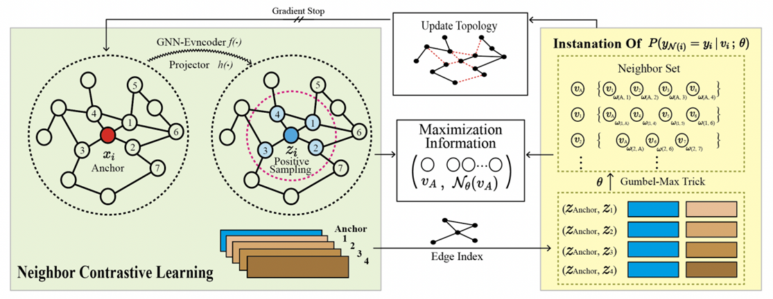 论文Contrastive Learning Meets Homophily: Two Birds with One Stone(第一作者:何东晓)创新地将自监督对比学习与图异质性问题融合,在同质、异质数据集上都可以以无监督的形式学习有效的表征。图自监督学习近年来取得了令人肯定的发展,但已经提出的方法基于数据的同质性假设,无法适配异质性数据集。在解决异质图数据问题上提出的工作普遍使用监督或半监督的方法。本文提出了NeCo(Neighbor Contrastive Representation Learning on Graphs)方法,大胆抛弃以往通用的数据增强采样方式,而是引入异质性判别器,结合伯努利分布对异质边建模并去除,以阻断异质噪音在图神经网络中传播。同时保留的同质边所链接的邻居节点被采样为自监督学习的正例对以作为自监督目标训练。