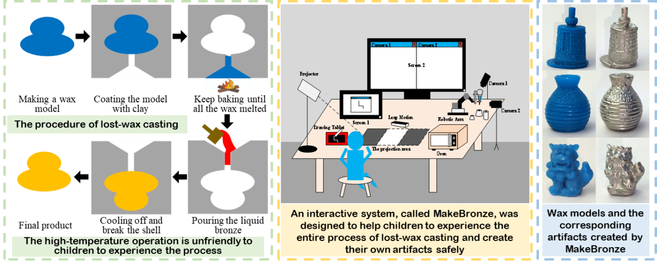本工作围绕失蜡铸造这一青铜器代表性生产工艺,首次提出了一种安全便捷、面向青少年的体验式教学系统,用于促进中国青铜文化在青少年群体中的传播。中国青铜器历史悠久、外型精美,是中国传统文化的重要象征。然而,现有青铜文化传播多基于书本、视频及展览,缺乏体验式的宣传途径,沉浸性与趣味性有待提高。此外,青铜器铸造过程涉及高温操作,这对大众体验学习其生产工艺造成了阻碍。研究团队利用机械臂突破了安全问题对体验学习的制约,并引入适合青少年的人机交互方法,提高了教学效率,充分调动学生的学习积极性。实验表明,该系统帮助用户更好地了解青铜器的失蜡法铸造过程,并显著提高了他们对青铜文化的学习兴趣。这项研究为后续面向青少年的交互系统设计提供了借鉴,也为传统文化的传播与保护提供了新思路。