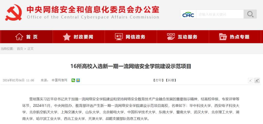 近日,中央网信办、教育部评选产生了新一期一流网络安全学院建设示范项目高校,天津大学等16所高校成功入选。
