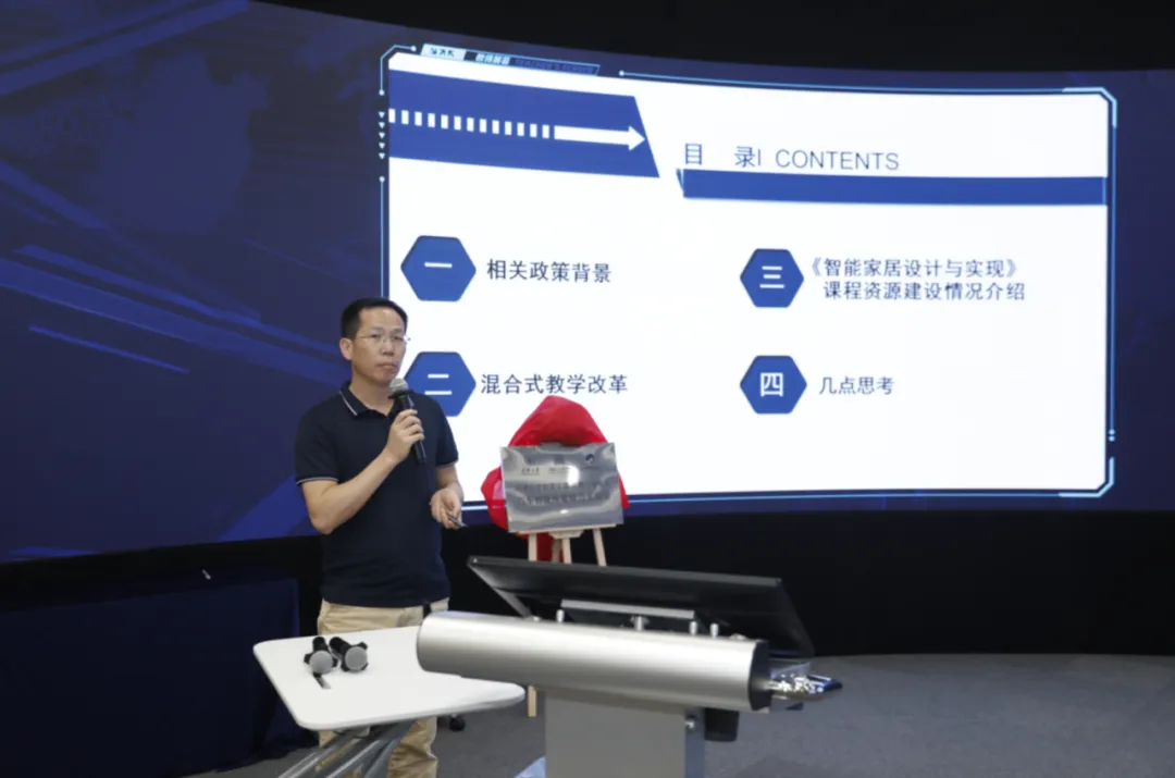 盈趣科技总裁助理陈建成进行了全国智能家居产教融合共同体重点工作报告。共同体成立后,针对智能家居领域人才培养基础教材编写、教具开发、职业标准起草、实训教育基地建设等方面开展工作,未来将在智能家居与脑机接口产品结合方面开展更多创新合作。