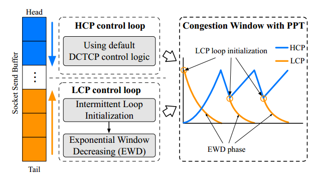 本篇工作提出一种实用数据中心传输方案PPT,旨在保留响应式传输的可部署性优势,同时有效地利用空闲带宽来最小化流完成时间(Flow Completion Time, FCT)。通过深入探索响应式传输行为,得出一个关键发现:填充拥塞窗口到每个流的历史最大值,可以帮助响应式传输优雅地利用空闲带宽。PPT系统有两个关键部分:(1)双回路速率控制算法。通过运行一个低优先级控制回路,以利用响应传输留下的空闲带宽。(2)缓冲区感知的流调度机制。通过感知系统调用复制到TCP发送缓冲区的数据大小来识别大流,并通过镜像对称数据包标记技术分配优先级,保证小流可以绕过队列中的大流,同时保证了高优先级控制回路性能不会受到低优先级控制回路的损害。作者已经在Linux内核中实现了一个PPT系统原型,并证明与先进的主动传输方案相比,实现了更低的整体平均FCT以及小流尾延时。