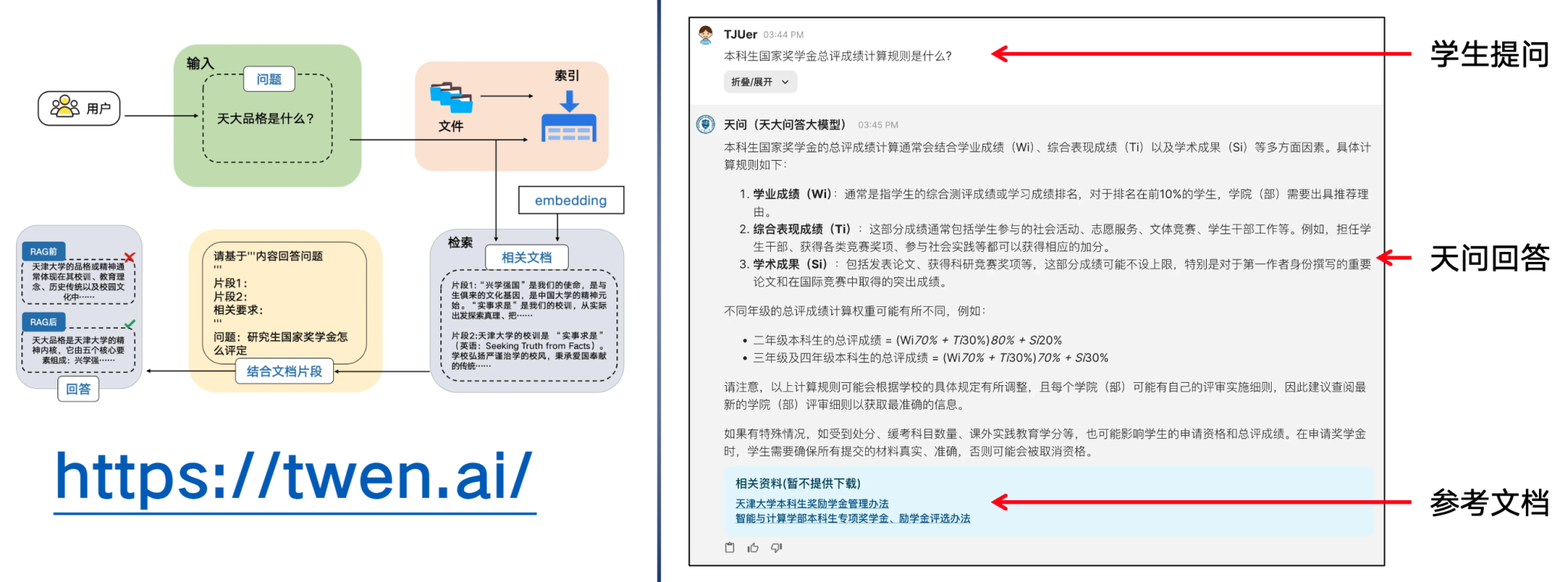 “天问”(Twen.ai)是全国首个高校问答大模型,基于RAG检索增强技术,通过文本切分、向量化模型优化和语义相似度检索等技术,显著提高了校园问答的效率和准确性。目前已在天大多个学院范围内完成试点测试,有望成为天津大学的基础服务设施,在学习生活、升学就业、科研学术等方面为师生提供全面、快速、准确的咨询服务。