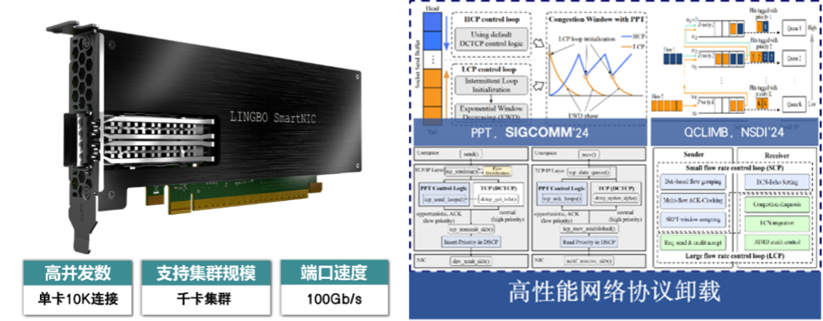 “凌波”智能网卡,是为大规模网络集群打造的新一代国产数据处理引擎,基于RDMA自研高性能网络协议HP4,广泛兼容国产 CPU、GPU 和服务器,具备高扩展性、高并发性、高兼容性、高性价比四大特点,致力于解决 AI 大规模万卡集群互联的网络通信瓶颈,为国产信创生态实现自主可控、兼容互通奠定互联基石。