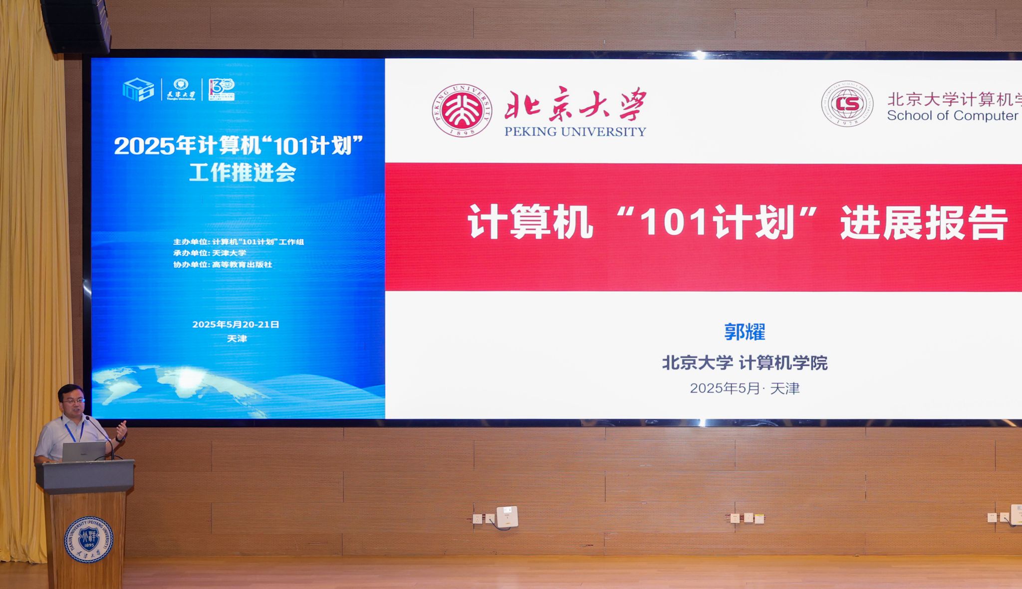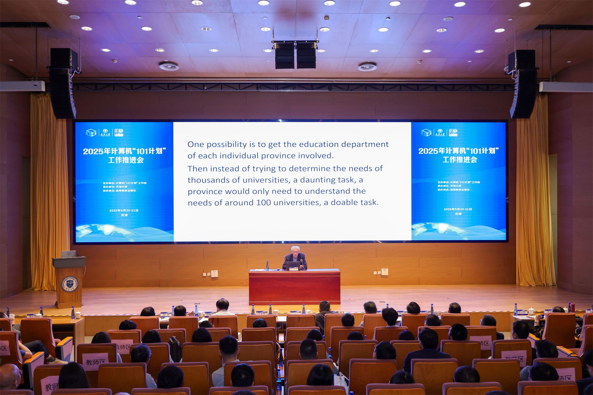 5月20-21日,2025年计算机“101计划”工作推进会在津顺利召开,会议由计算机“101计划”工作组主办,天津大学承办,高等教育出版社协办。教育部计算机“101计划”的主要发起人、工作组专家委员会代表John Hopcroft教授莅临会议并做特邀报告,教育部高等教育司理工处盛晓光、天津市教育委员会高教处处长徐震、天津大学党委常委副校长王天友出席会议并致辞,计算机“101计划”工作组高校负责人、核心课程负责人、各省工作组(筹备组)负责人与主要代表120余人参会。会议围绕计算机“101计划”后续工作规划进行了主题报告与研讨,正式成立了计算机“101计划”京津冀工作组,并组织了“101计划走进高校”系列活动。