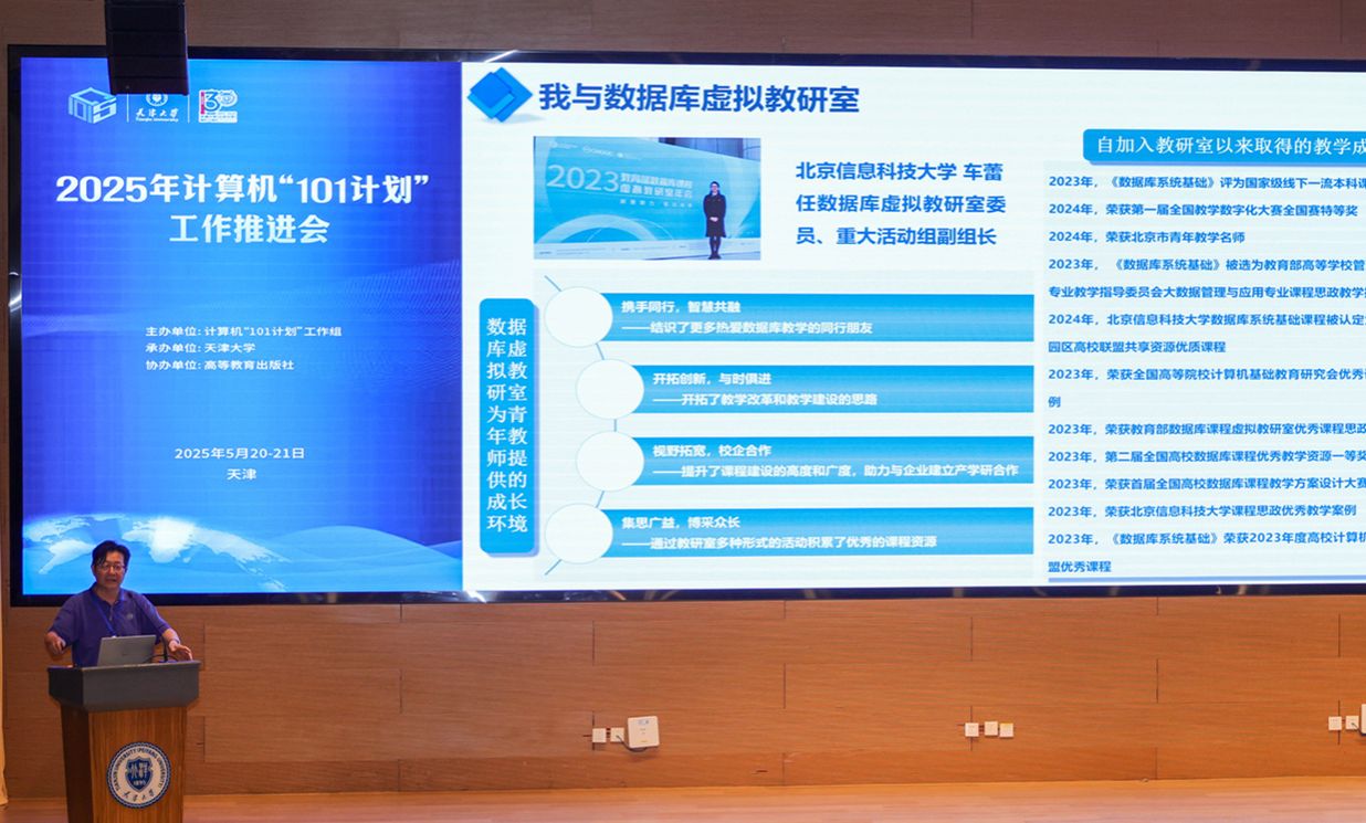 主题报告环节由UFC中文官网 党委书记魏建国主持,京津冀工作组专家委员会组长、中国人民大学杜小勇教授针对“101计划”数据库系统课程建设与推广应用情况进行了报告。