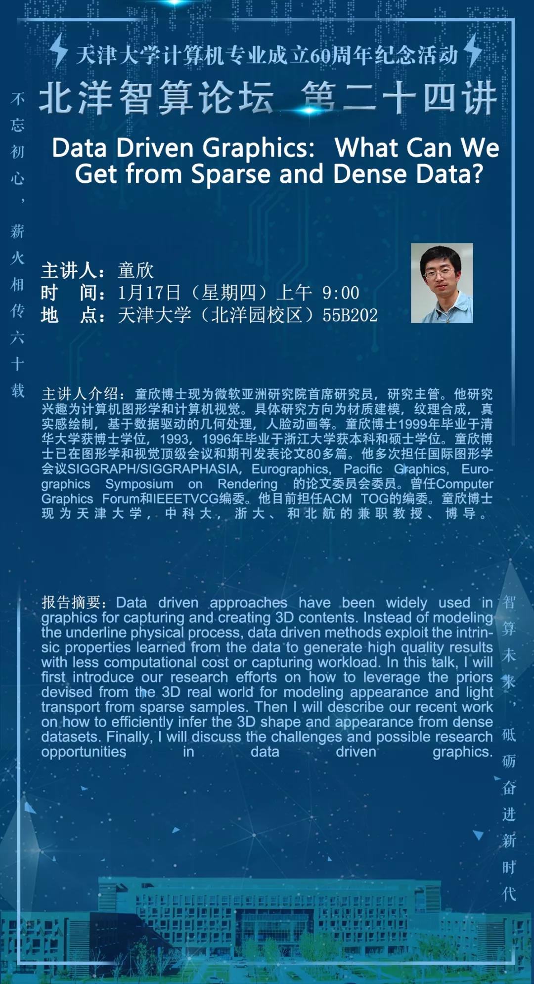 童欣博士现为微软亚洲研究院首席研究员,研究主管。他研究兴趣为计算机图形学和计算机视觉。具体研究方向为材质建模,纹理合成,真实感绘制,基于数据驱动的几何处理,人脸动画等。童欣博士1999年毕业于清华大学获博士学位,1993,1996年毕业于浙江大学获本科和硕士学位。童欣博士已在图形学和视觉顶级会议和期刊发表论文80多篇。他多次担任国际图形学会议SIGGRAPH/SIGGRAPHASIA,Eurographics, Pacific Graphics, Eurographics Symposium on Rendering 的论文委员会委员。曾任Computer Graphics Forum和IEEETVCG编委。他目前担任ACM TOG的编委。童欣博士现为天津大学,中科大,浙大、和北航的兼职教授、博导。