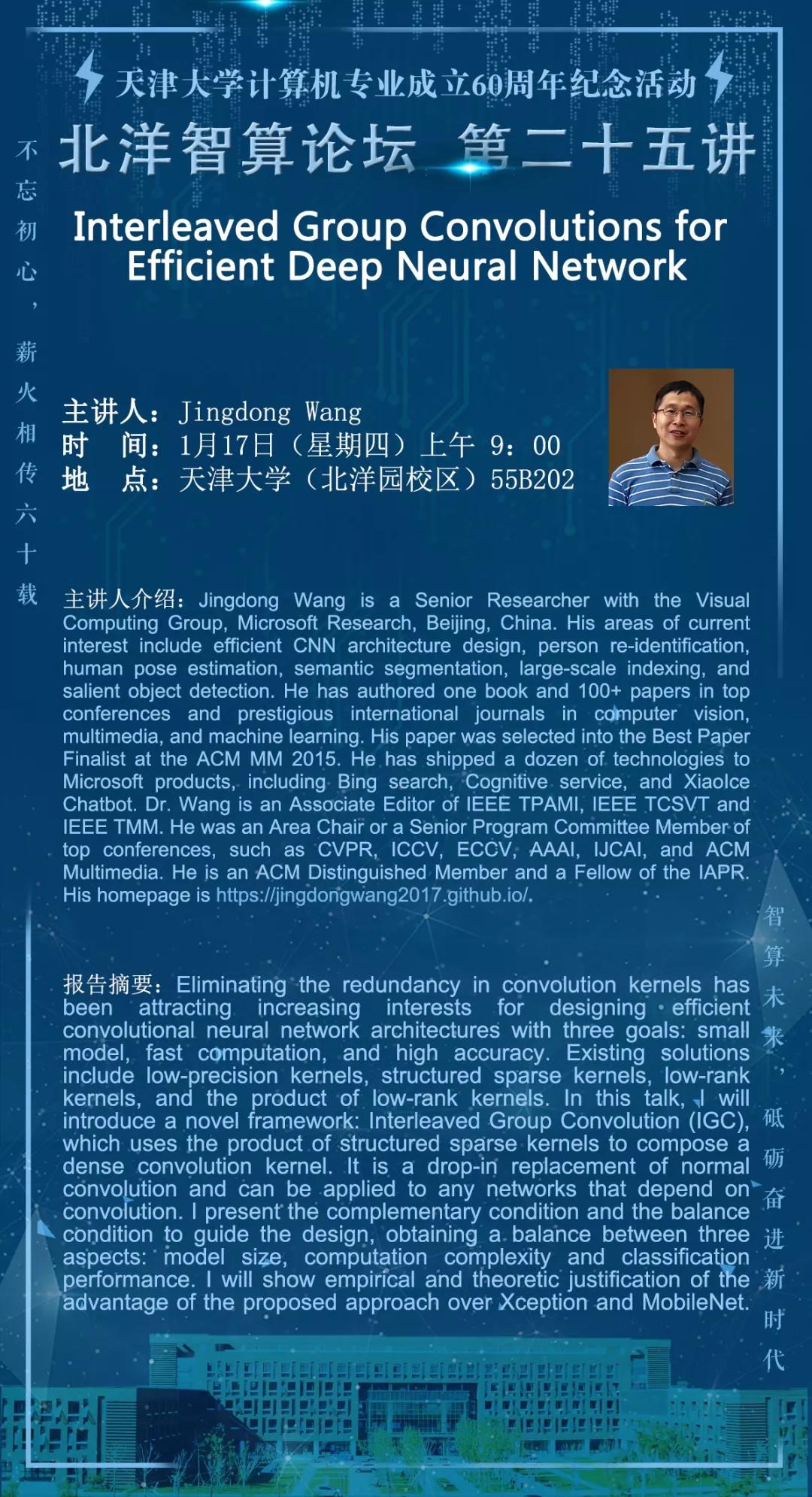 Eliminating the redundancy in convolution kernels has been attracting increasing interests for designing efficient convolutional neural network architectures with three goals: small model, fast computation, and high accuracy. Existing solutions include low-precision kernels, structured sparse kernels, low-rank kernels, and the product of low-rank kernels. In this talk, I will introduce a novel framework: Interleaved Group Convolution (IGC), which uses the product of structured sparse kernels to compose a dense convolution kernel. It is a drop-in replacement of normal convolution and can be applied to any networks that depend on convolution. I present the complementary condition and the balance condition to guide the design, obtaining a balance between three aspects: model size, computation complexity and classification performance. I will show empirical and theoretic justification of the advantage of the proposed approach over Xception and MobileNet.
