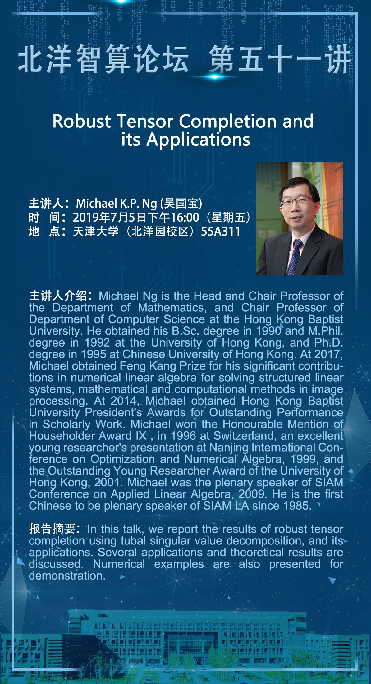 Michael Ng is the Head and Chair Professor of the Department of Mathematics, and Chair Professor of Department of Computer Science at the Hong Kong Baptist University. He obtained his B.Sc. degree in 1990 and M.Phil. degree in 1992 at the University of Hong Kong, and Ph.D. degree in 1995 at Chinese University of Hong Kong. At 2017, Michael obtained Feng Kang Prize for his significant contributions in numerical linear algebra for solving structured linear systems, mathematical and computational methods in image processing. At 2014, Michael obtained Hong Kong Baptist University President's Awards for Outstanding Performance in Scholarly Work. Michael won the Honourable Mention of Householder Award IX , in 1996 at Switzerland, an excellent young researcher's presentation at Nanjing International Conference on Optimization and Numerical Algebra, 1999, and the Outstanding Young Researcher Award of the University of Hong Kong, 2001. Michael was the plenary speaker of SIAM Conference on Applied Linear Algebra, 2009. He is the first Chinese to be plenary speaker of SIAM LA since 1985.