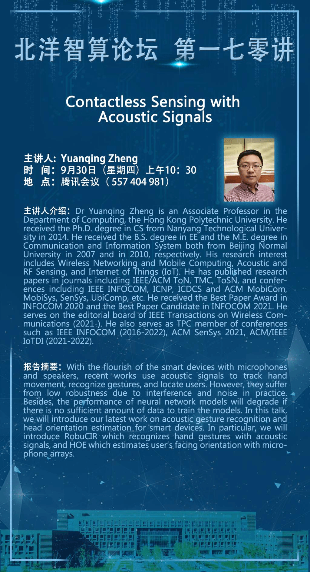 Dr. Yuanqing Zheng is an Associate Professor in the Department of Computing, the Hong Kong Polytechnic University. He received the Ph.D. degree in CS from Nanyang Technological University in 2014. He received the B.S. degree in EE and the M.E. degree in Communication and Information System both from Beijing Normal University in 2007 and in 2010, respectively. His research interest includes Wireless Networking and Mobile Computing, Acoustic and RF Sensing, and Internet of Things (IoT). He has published research papers in journals including IEEE/ACM ToN, TMC, ToSN, and conferences including IEEE INFOCOM, ICNP, ICDCS and ACM MobiCom, MobiSys, SenSys, UbiComp, etc. He received the Best Paper Award in INFOCOM 2020 and the Best Paper Candidate in INFOCOM 2021. He serves on the editorial board of IEEE Transactions on Wireless Communications (2021-). He also serves as TPC member of conferences such as IEEE INFOCOM (2016-2022), ACM SenSys 2021, ACM/IEEE IoTDI (2021-2022).