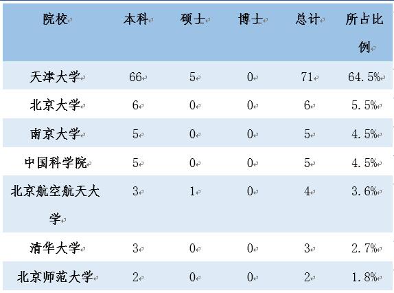 升学到天津大学的人数共71人,占总国(境)内升学人数的64%。毕业生在国(境)内高校深造情况如下表所示: